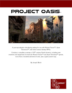 Project Oasis, written by Joseph Bloch (Adventures Dark and Deep, Castle of the Mad Archmage) and self-published through BRW Games, is a 36-page PDF campaign supplement for Mutant Future and Apes Victorious, both being post-apocalypse (PA) games by Goblinoid Games.